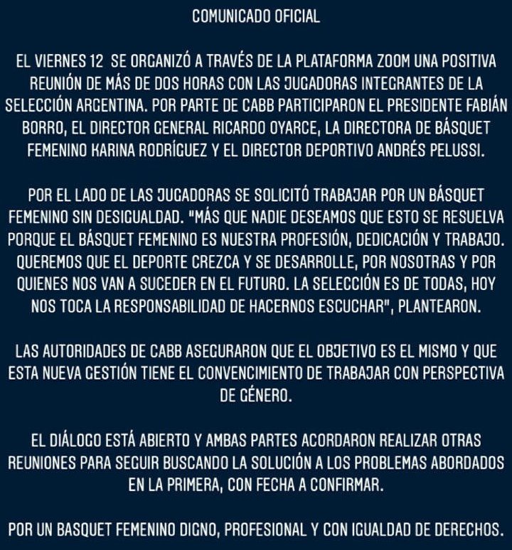 “#ComunicadoOficial El viernes a las 10 habrá una reunión a través de la plataforma Zoom con jugadoras integrantes del plantel que nos representó en la última competencia oficial disputada por Las Gigantes”.